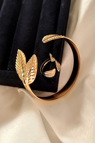 ست بنگل و انگشتر فشن طرح برگ طلایی