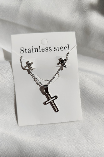 نیمست گوشواره و گردنبند استیل رنگ ثابت طرح صلیب