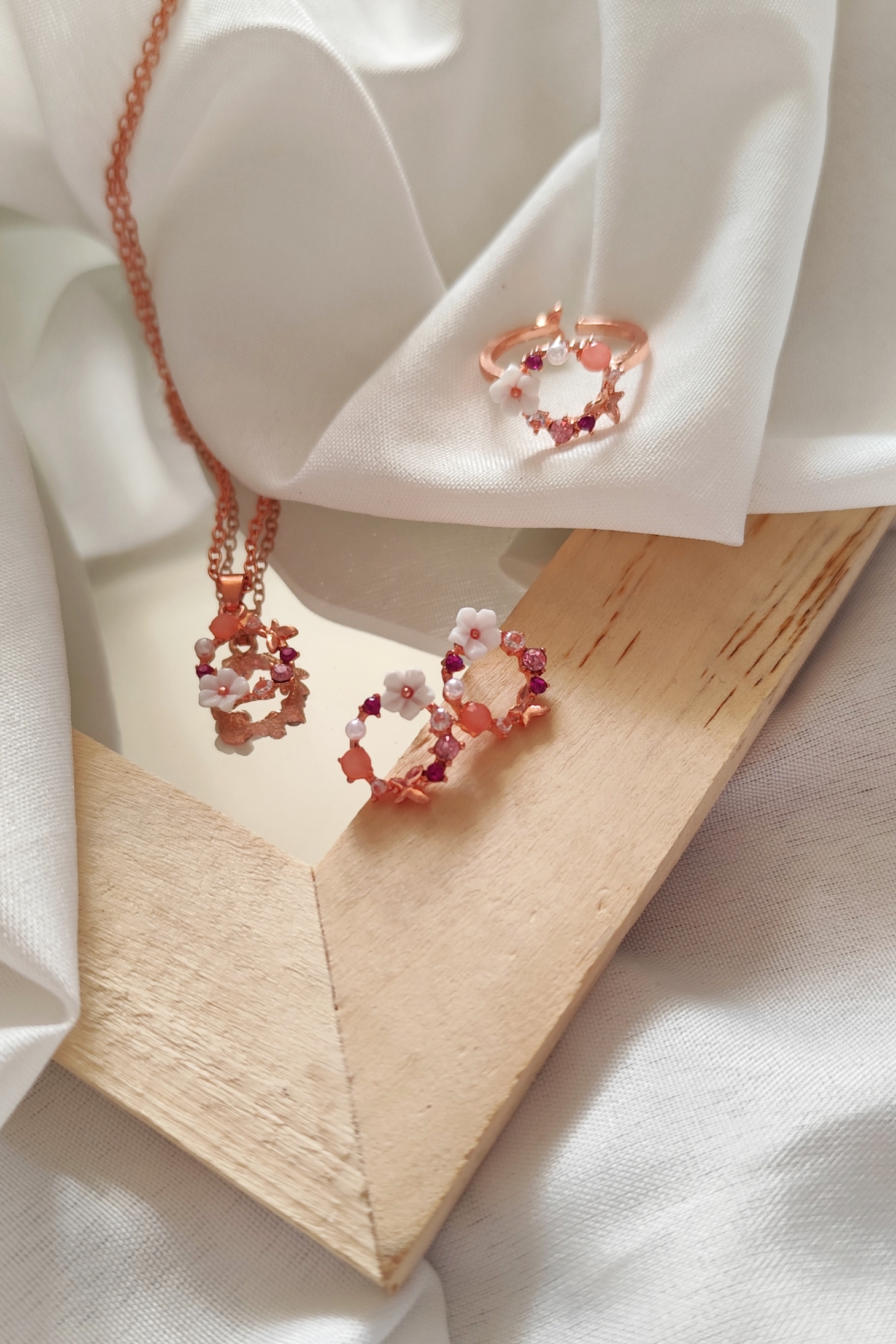 ست گردنبند و گوشواره و انگشتر شکوفه رنگ مسی