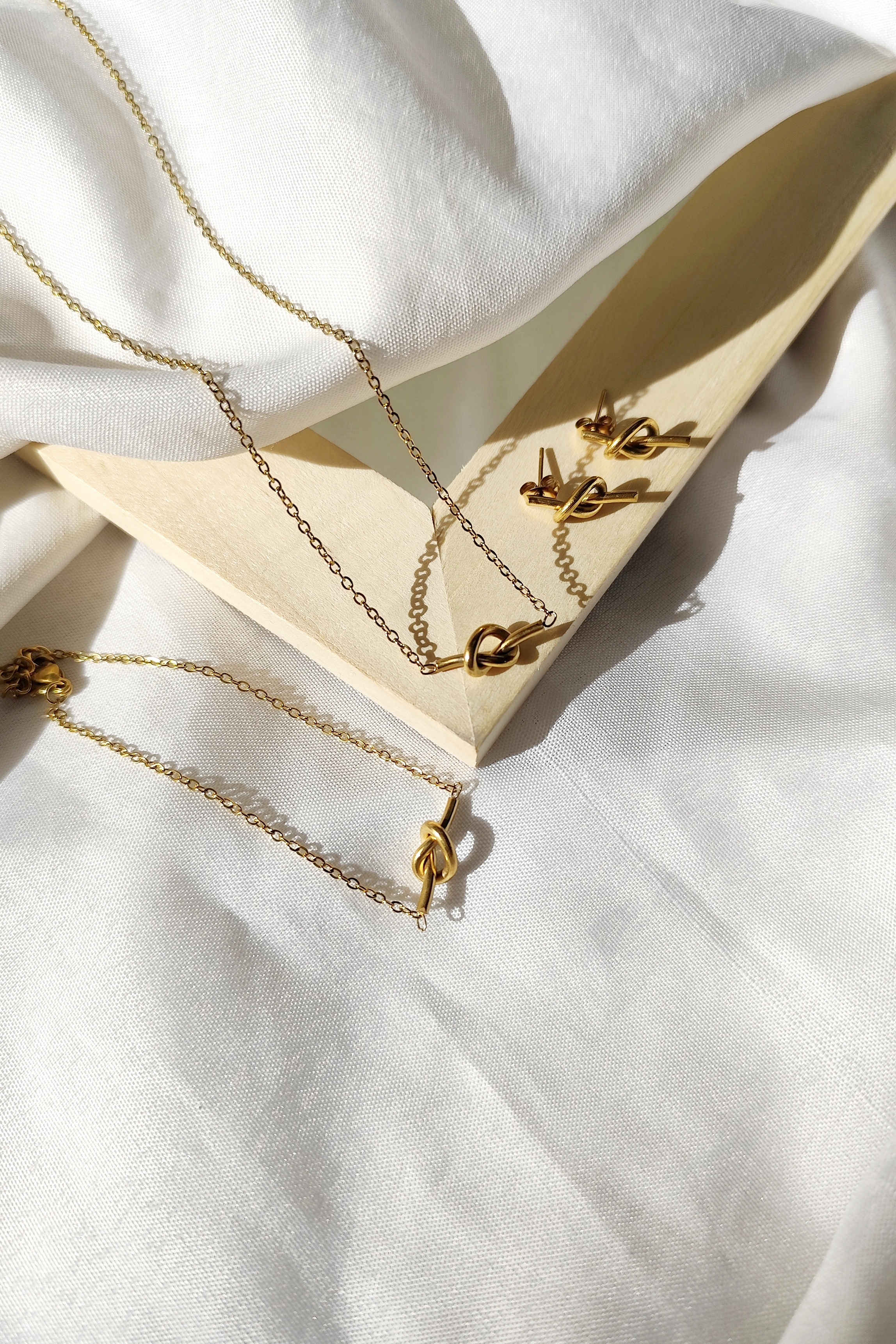 ست گوشواره و گردنبند و دستبند گره طلایی رنگ ثابت 💫